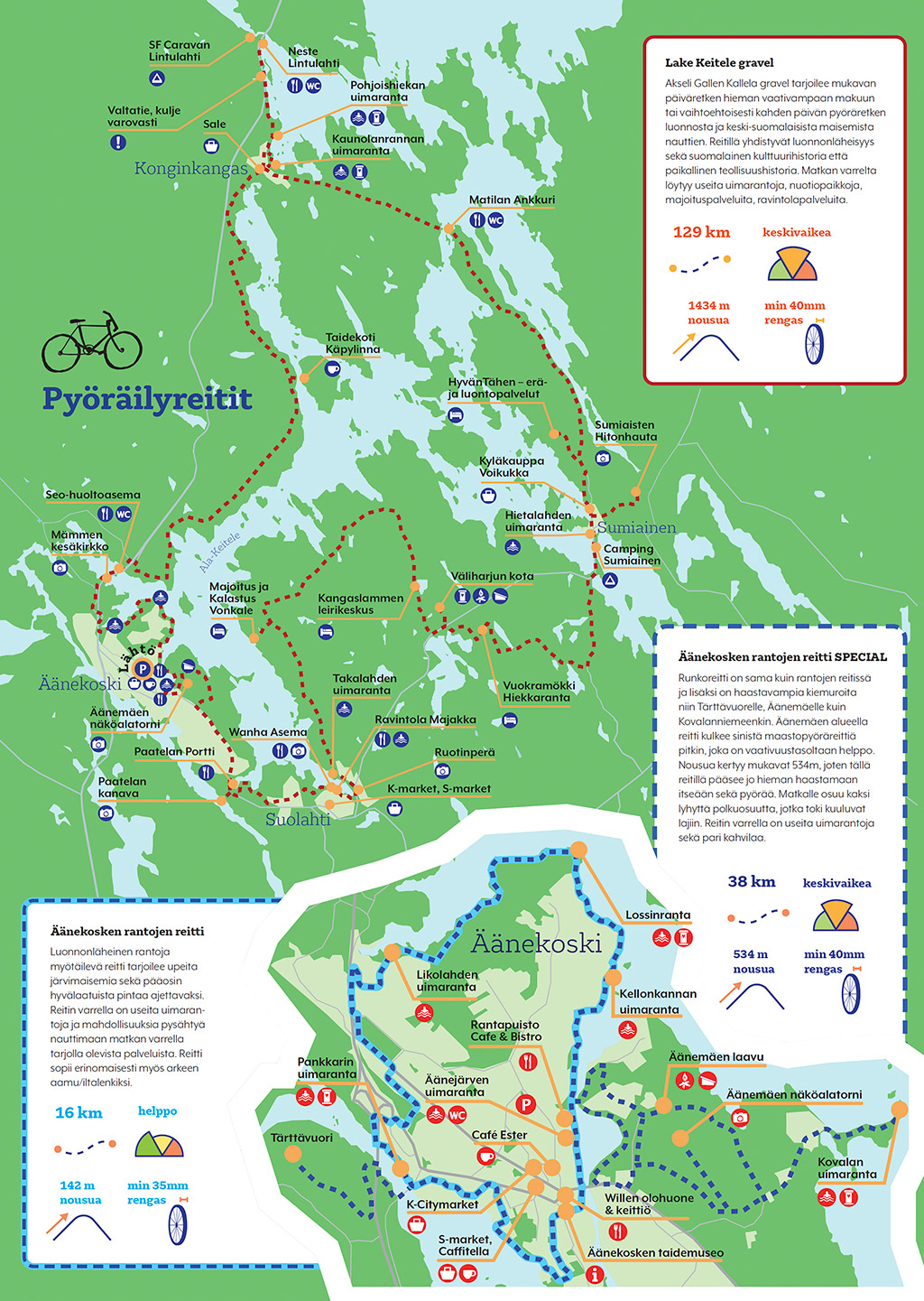 Äänekosken rantojen reitti on 16 kilometrin pituinen järvimaisemia myötäilevä helppokulkuinen reitti. Se tarjoaa sekä arkilenkeille ja rauhalliseen retkiajoon sopivan kokonaisuuden. Reitti kuljettaa pyöräilijän järvien rantoja pitkin, metsän reunamilla ja matkan varrella avautuu useita mahdollisuuksia pysähtyä uimapaikoilla tai hyödyntää alueen palveluita.